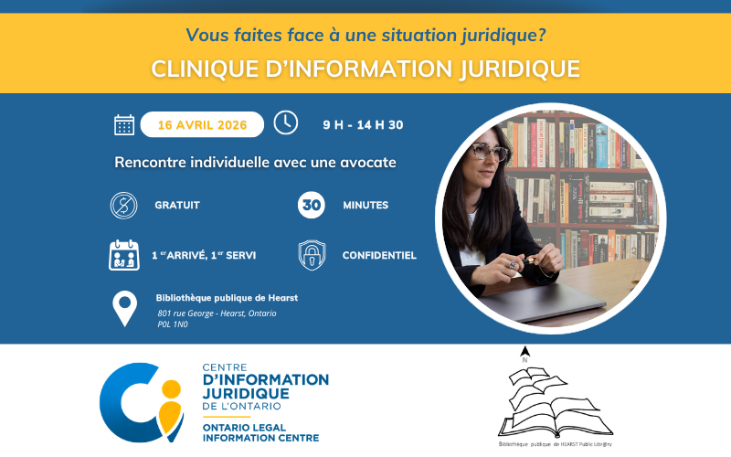 À noter : notre Centre ne peut pas vous offrir de conseils juridiques. Cliquez ci-dessous afin de saisir la différence entre de l’information juridique et des conseils juridiques en un clin d’œil!